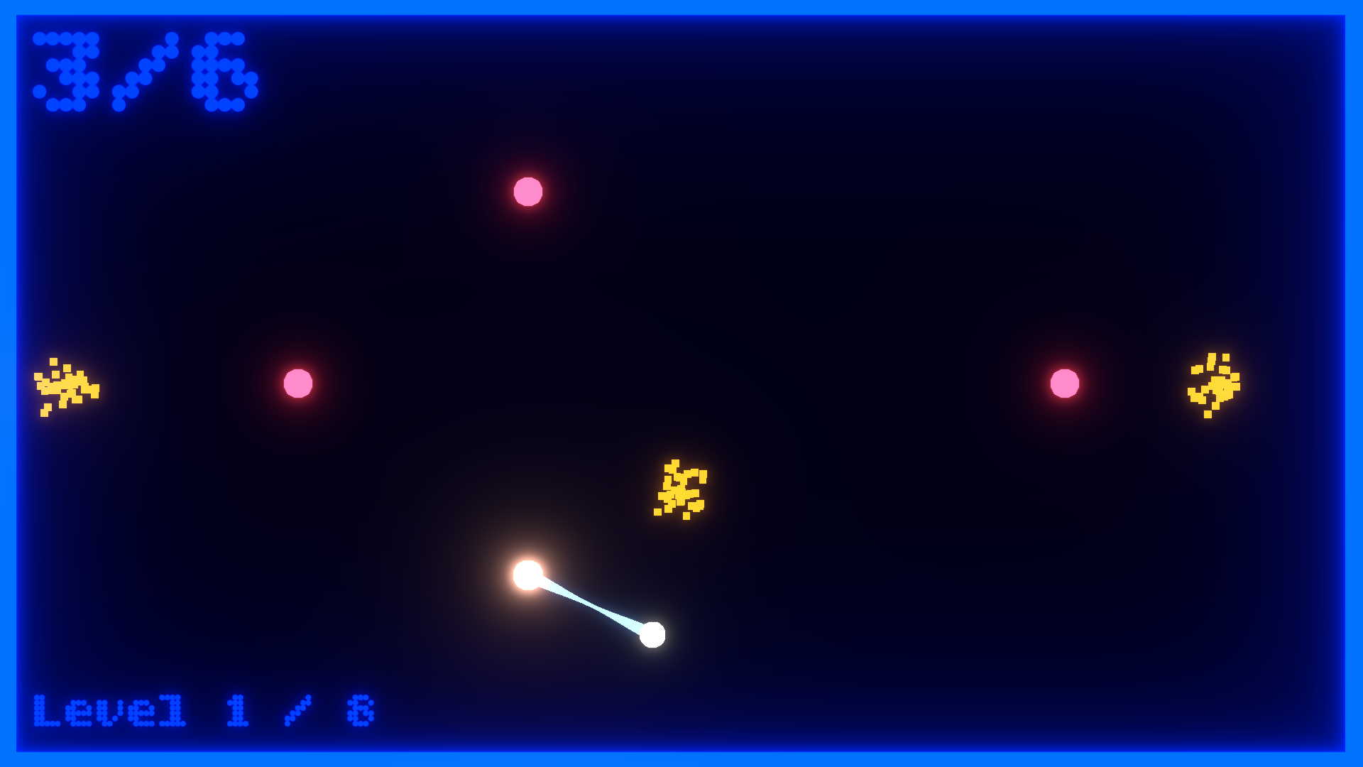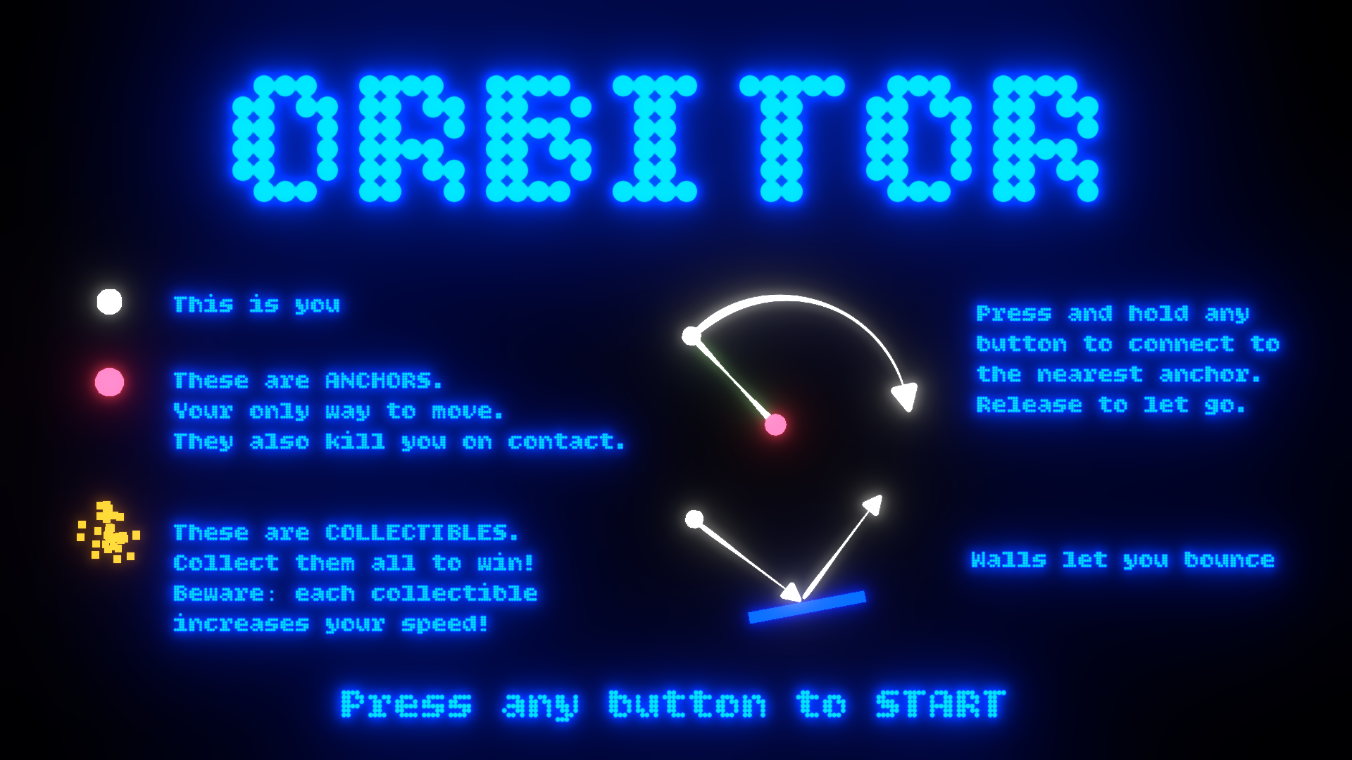 Fling yourself around deadly obstacles to collect all the treasure! In Orbitor, you have only one way of controlling your path: by pressing and holding, you start orbiting the nearest anchor point. But beware! These anchors will kill you on contact, so don't get too close. Collect all the collectibles in a level to complete it!